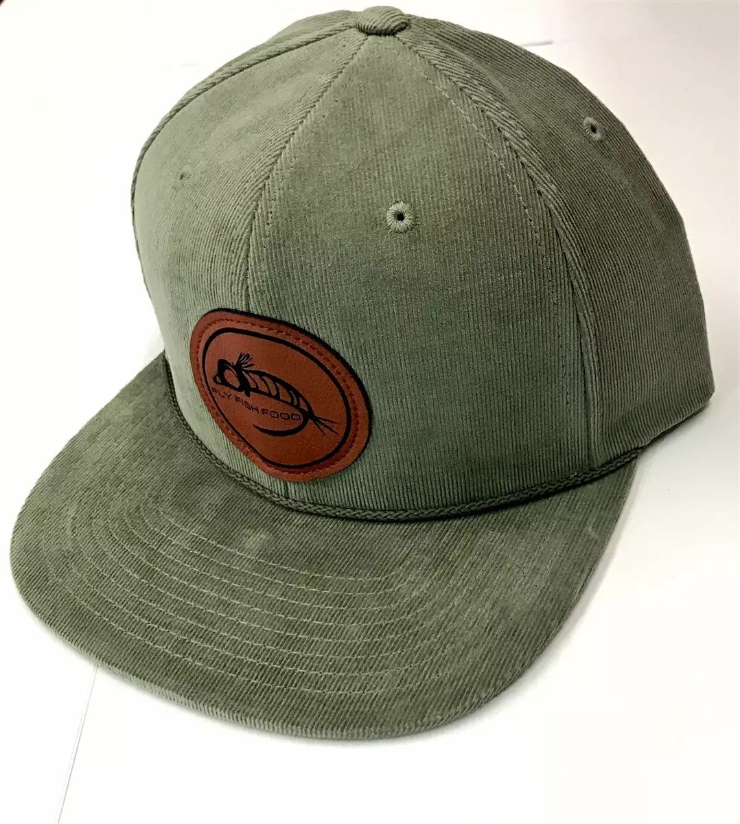 Snap back hat with a simple Fly Fish Food logo. Olive Corduroy. 1 size fits all.